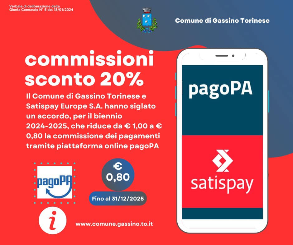 Il comune di Gassino Torinese e Satispay Europe S.A. hanno siglato un accordo, per il biennio 2024-2025, che riduce da € 1,00 a € 0,80 la commissione dei pagamenti tramite piattaforma online pagoPA.